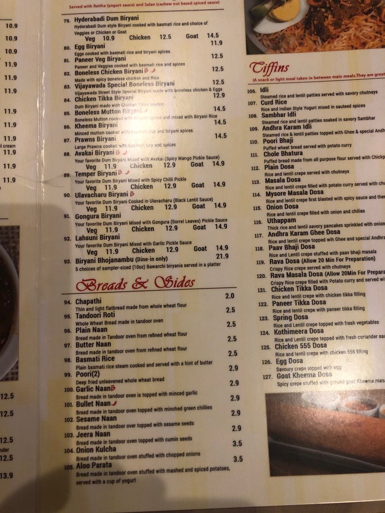 Hyderabadi Dum style Biryanis cooked with basmati rice and choice of Vegetables or meat. Add flavors for more zing! Biryanis accompany 4oz raitha and 4oz salan.